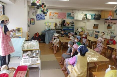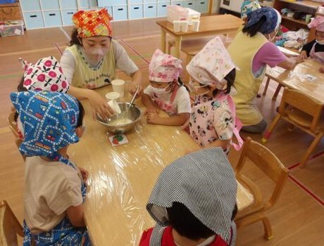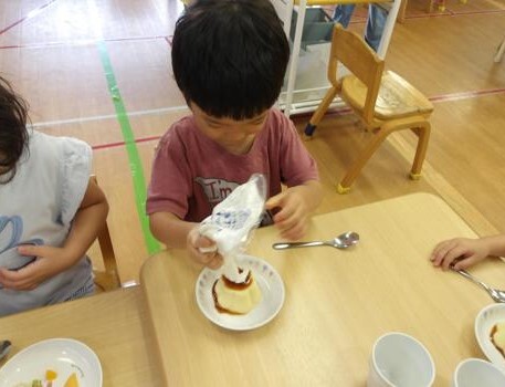 「プリンがにがて」て言う子、「カラメルソースがいやだなあ」と声も聞かれながらも、エプロン、三角巾を付けると真剣に担当の保育者の声に耳を傾けて、プリンづくりに参加することができました。午後のおやつの時間に、いちご、バナナ、みかん、生クリームを自分たちでトッピング。にがてと言っていた子どもたちも「おいしい」と一層笑顔になりました。