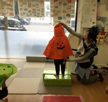 今日は「ハロウィン」で朝から楽しみにしている子どもたち。幼児クラスではそれぞれ好きな装いで入室して、部屋にレッドカーペットを敷いて順番にファッションショーが始まり、いつもと違う自分たちを披露しました。