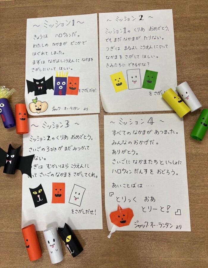 今年のハロウィンはジャックオーランタンからの、ミッションが記された手紙から、近隣の公園を巡って宝さがしがスタート。ミッションをクリアしていく度にドキドキ、ワクワクしながら楽しく過ごしました。