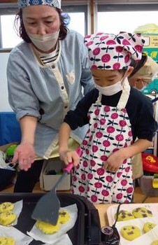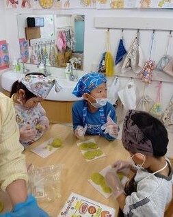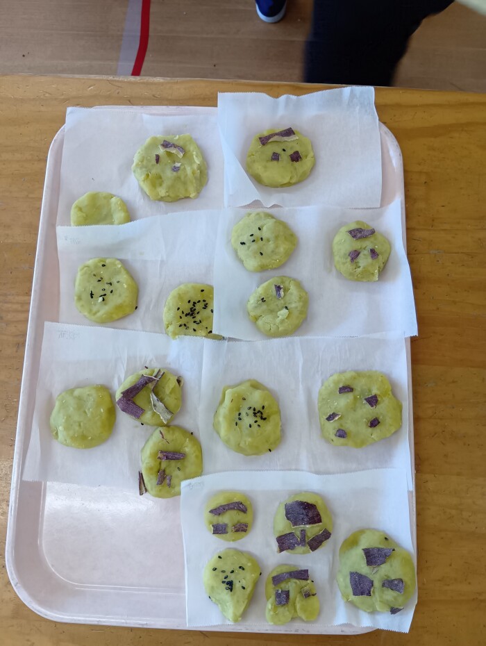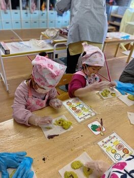 「さつまいももち やけたかな」という絵本の導入から、ふかしたさつまいもを袋の中に入れて上から潰したしたところに片栗粉を混ぜて、うさぎや顔の形を皮やごまを使って成形して楽しみました。