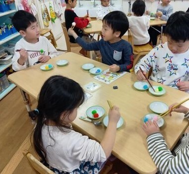 お箸について、持ち方から物を挟むことを個々の子どもたちに合わせて、ポンポンを箸で摘まんで楽しみながら行ないました。