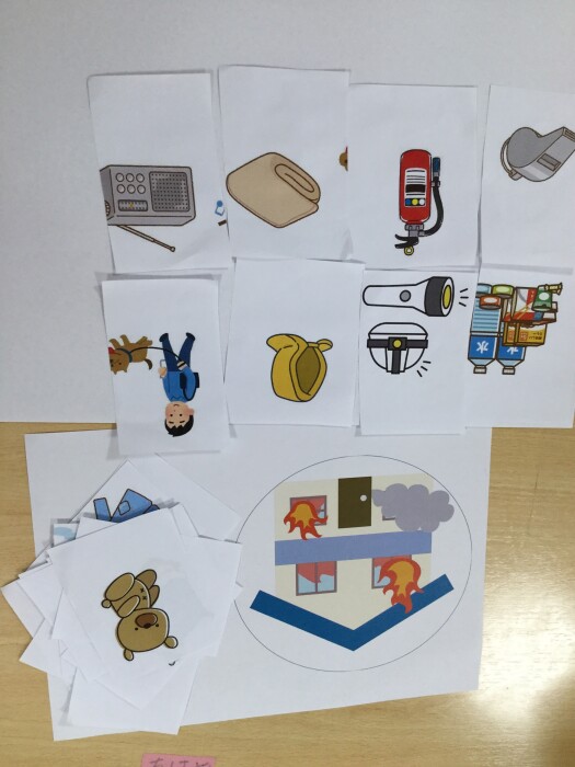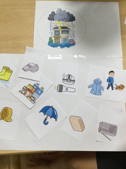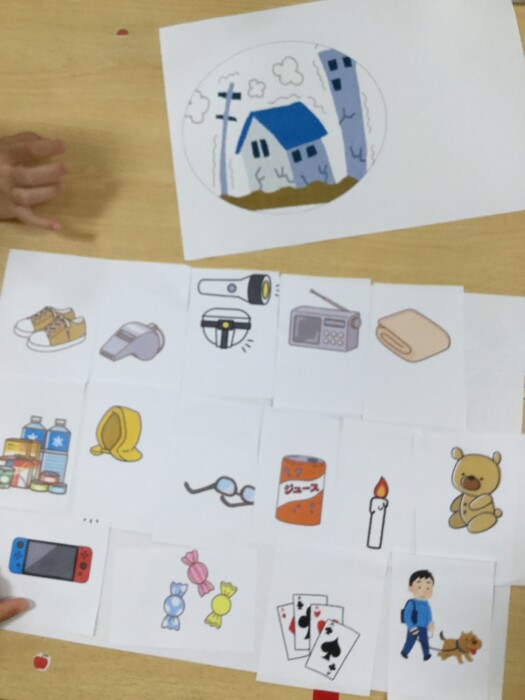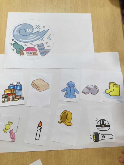 保健教育では、火事、台風、地震、雷雨を想定して、避難するときに必要なものとそうでないものについて考えたり、保育園で地震が発生した時に安全な場所はどこなのか意見を出し合ったりしました。