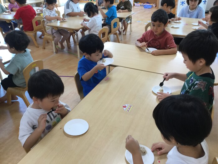 きのこごはんは「いいにおーい、おいしい!」と言う子もいれば、「なんかにがかった」という子もいましたよ。