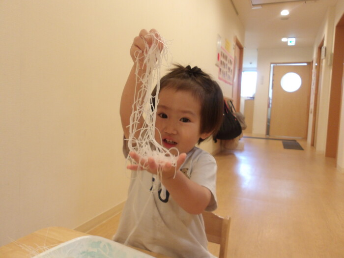 小麦粉粘土に興味津々の子どもたちは、ぎゅっと握ってみたり、ビヨーン!と伸ばしてみたり、保育者の真似をして手のひらに挟んでくるくると棒状にしてみたり、指先に力を入れながら遊んでいました!!