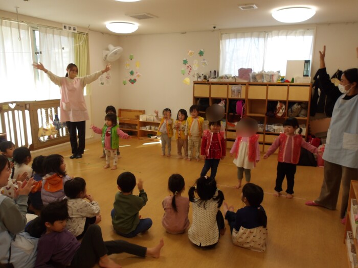日々の生活の中で楽しんでいる「わらべうた」や「ふれあい遊び」などを保育者や友だちと一緒に楽しんでいる姿を見てもらいました。