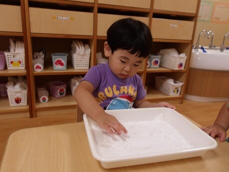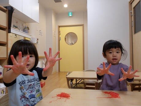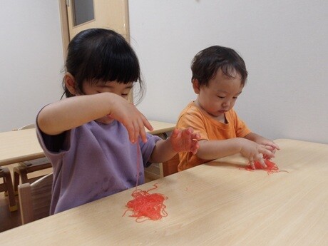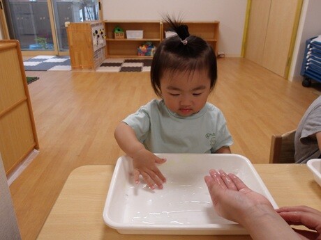 感触遊びが苦手な子もいますが、友だちが楽しそうに遊ぶ姿を見て、少しずつ興味を示しています。