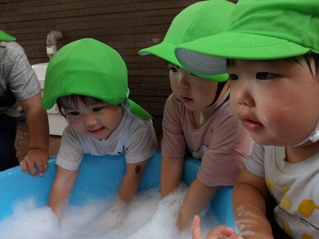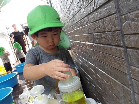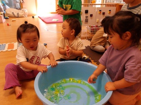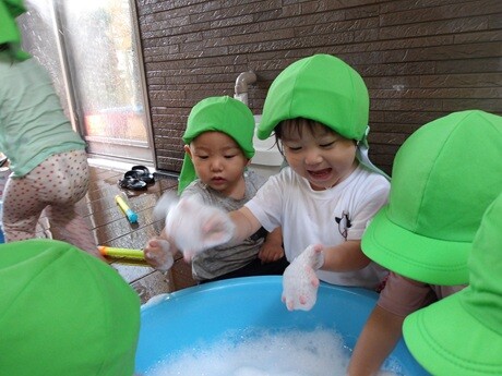 お水と一緒に色水や泡を触って遊ぶこともあります。