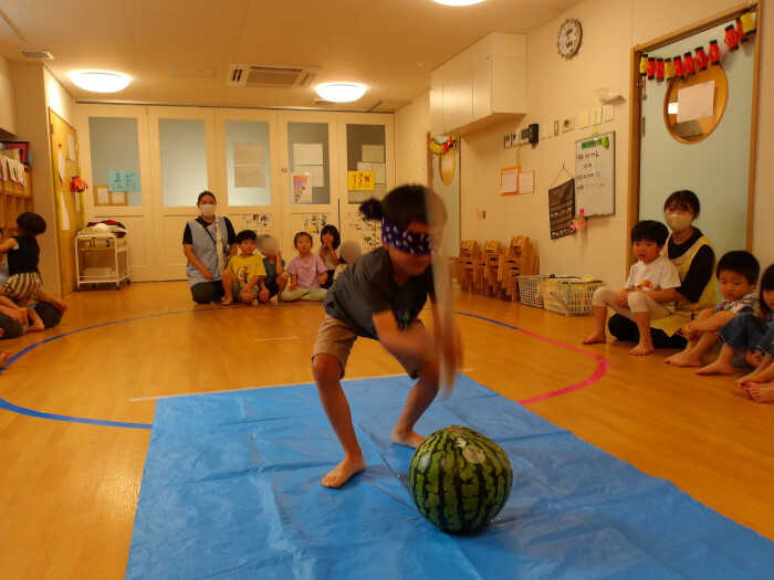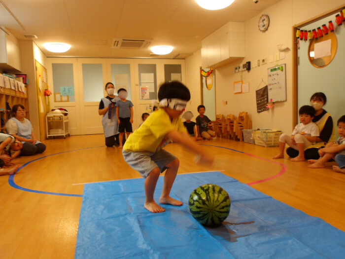 すいか割りでは昨年同様、目隠しをしてのすいか割りに挑戦。