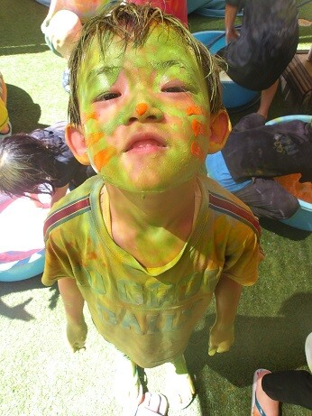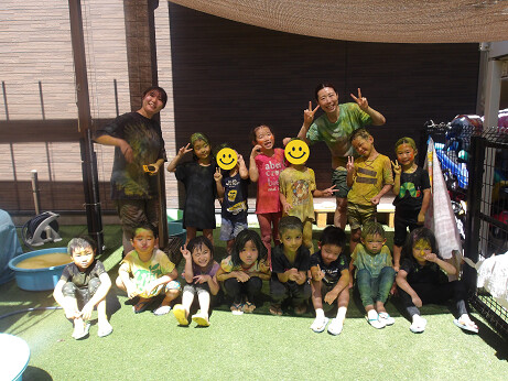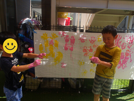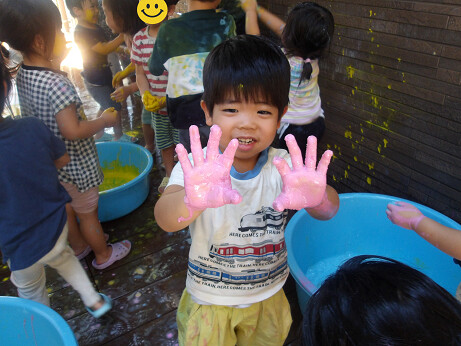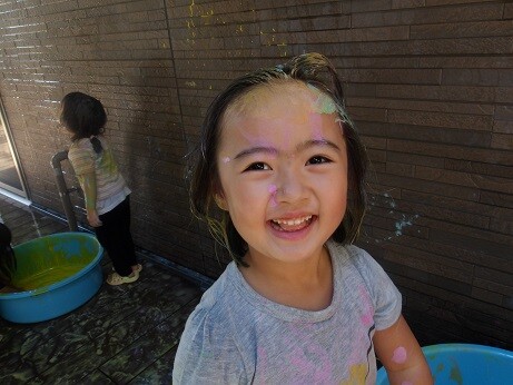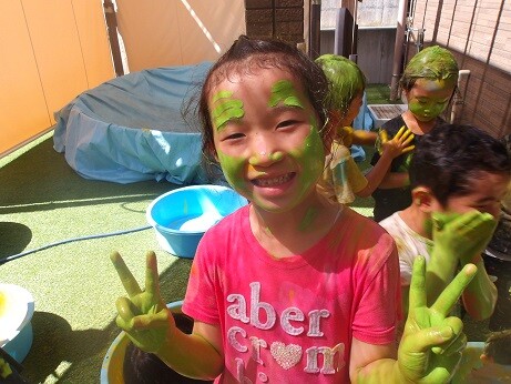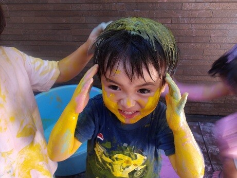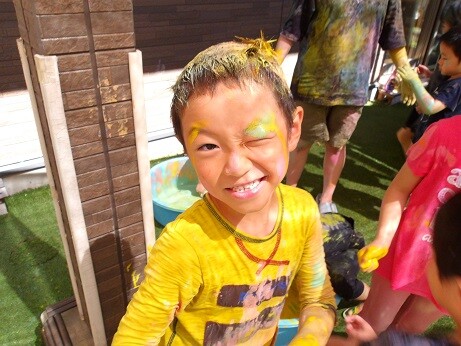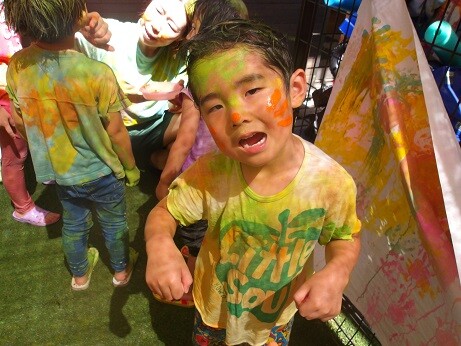 友だちや先生、自分の至る所に絵の具をつけては『ぬちゃぬちゃ〜』と感触を楽しんで、