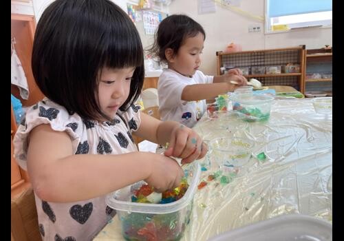 スプーンですくって、お皿に移したり、手で触って不思議な感触を楽しみました。