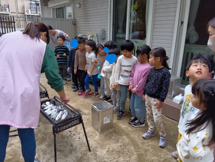 園庭では園長先生がコンロで焼いてくれ、ホクホクのおいしい焼き芋が出来上がり子供達は