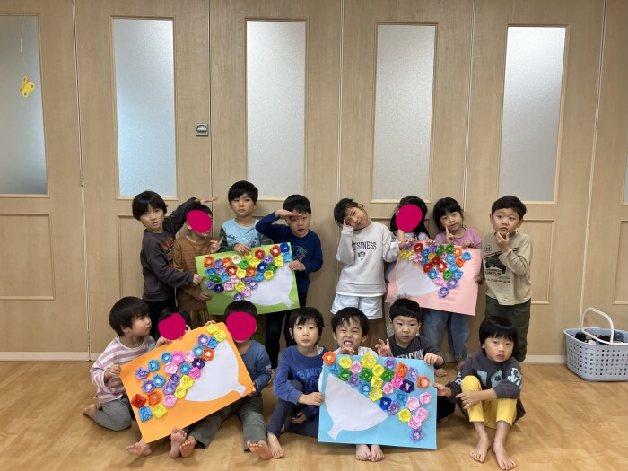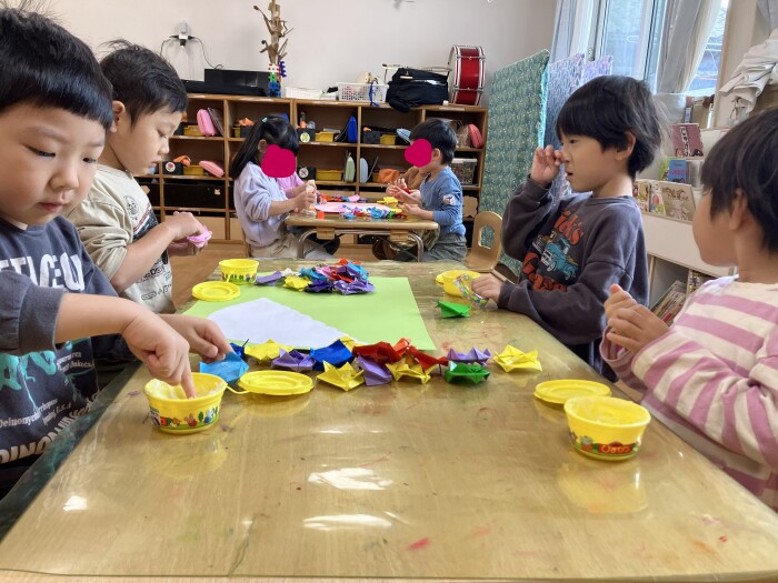 くま組のお友達と協力し一人ひとりが丁寧にお花を折りました!!