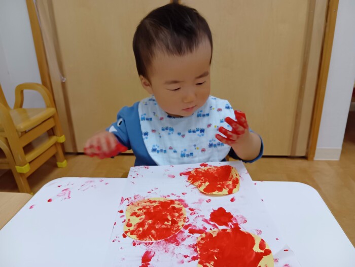 秋の果物といえば、りんご!真っ赤なりんごの製作をしました。手やたんぽに絵の具を付けて、画用紙に色を付けていきます。手で画用紙を叩くようにしたり、たんぽをぎゅっと握ってポンポン押したりして、自由に色を付けることを楽しんでいました。