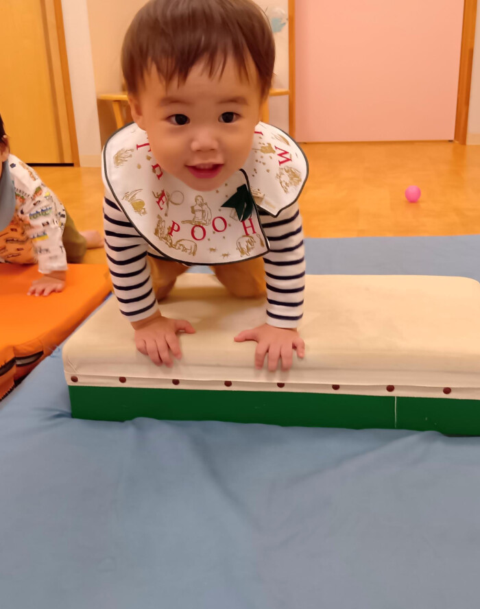 お部屋で運動遊びをしました。巧技台やマットを使って、段差を昇り降りしたり、はいはいで進んでいた子どもたち。全身を使って遊んでいます。
