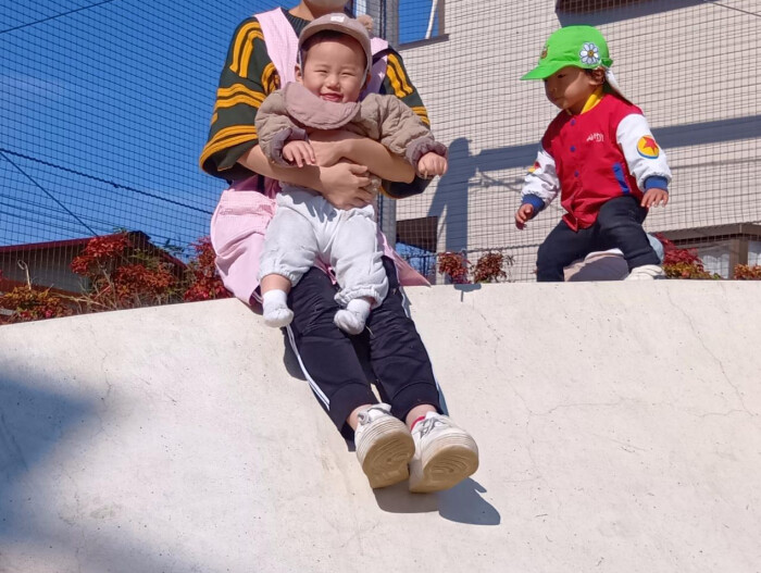 すべり台のある公園へ行きました。ゆるやかな傾斜で、ひよこ組さんでも楽しく滑ることができます。保育者と一緒にシュ〜!とっても楽しそうです。何度も繰り返し楽しみました。
