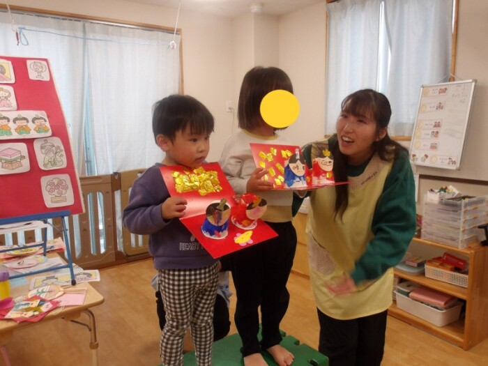 幼児クラスのお友だちは、「トイレットペーパーの芯でつくりました」「三人官女もつくりました」など自分の言葉でお話してくれてさすがでした!