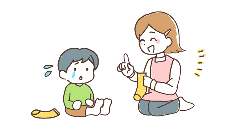 普段は一人で靴下を履くことができる子が、「できない!」と泣いていました。「そっか。今日はできなかったんだね。手伝っていい?」と気持ちを受け止め、履くのを手伝うなど必要な援助をしています。