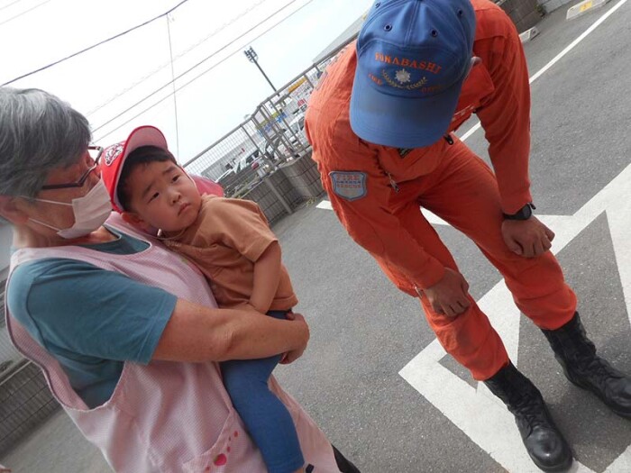さて、園庭までの避難が終わると、そこにはなんと消防士さんの姿が!!