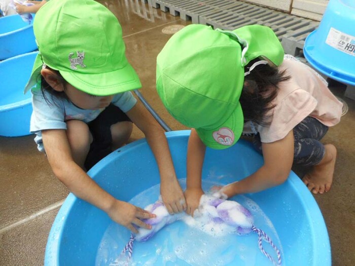 「アワアワ、できないね~」・「もっとゴシゴシするんだよ」なんて会話が聞こえます。