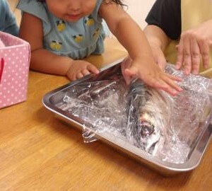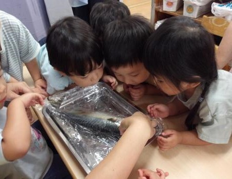 9月の食育だは魚の解体を行ないました。給食で提供されている鯖を準備して見たり触ったり、匂いを嗅いだり。そして幼児クラスでは、いつも給食を作ってもらっている調理師さんに目の前で捌いてもらうと子どもたちは興味津々な様子。捌いたお腹の中から小魚がたくさん出てきて、命が繋がっていくところも実際みることができて「すごい!」「これはなに?」といろいろな発見や気づきがありました。
