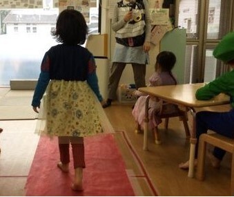 今日は「ハロウィン」で朝から楽しみにしている子どもたち。幼児クラスではそれぞれ好きな装いで入室して、部屋にレッドカーペットを敷いて順番にファッションショーが始まり、いつもと違う自分たちを披露しました。