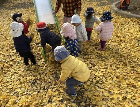 舞い落ちる様子を楽しんだり、お顔ほどもある大きな落ち葉に穴を空けて