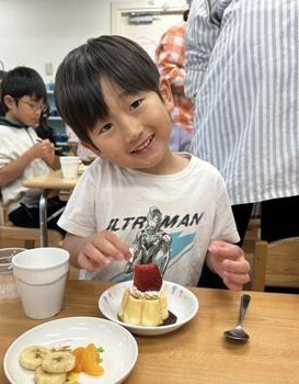 フルーツや生クリームものせて、とても美味しいプリンアラモードの出来上がり!
