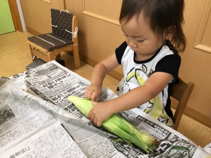 食育「とうもろこしの皮どうやって剥くのかな」