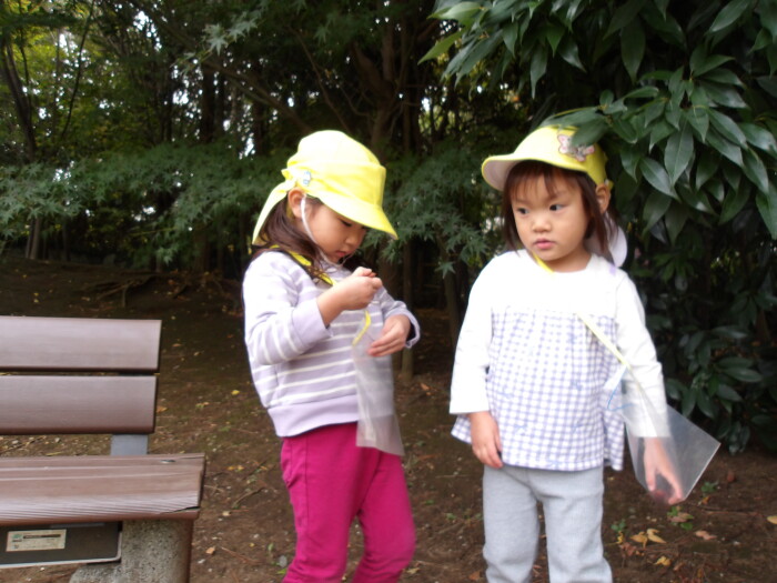 お散歩バックを持って探索開始☆たくさんのどんぐりや葉っぱなどなど