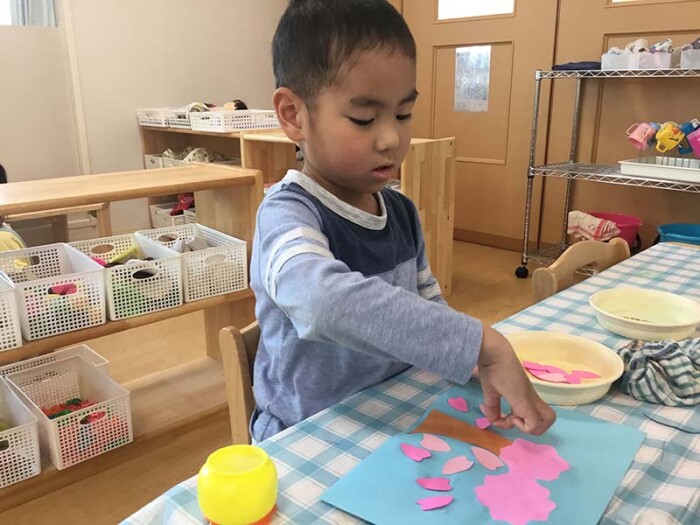 画用紙に木の幹と桜の花びらをのりでつけていきます。