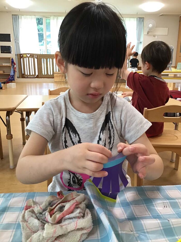 折り紙を折ったり、糊で貼ったり、ペンで種をたくさん描いたりスイカの模様を描いたりと、たくさんの工程がありました。