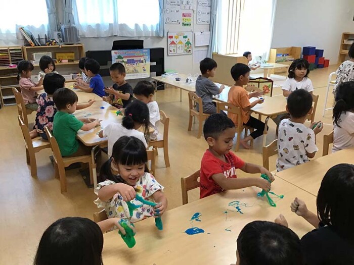 保育者が机にスライムの材料を並べて準備を始めると・・・みんな興味津々♡