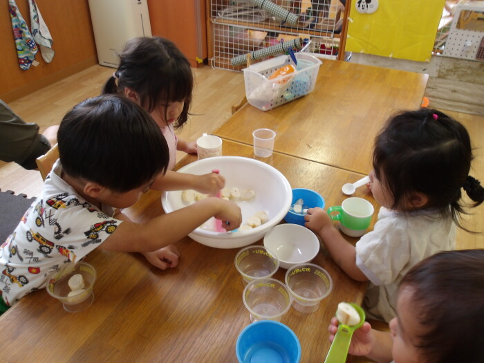 暑い日が続き、室内遊びが中心となってきました。お部屋でもたくさん遊び、元気いっぱいのうさぎ組のお友達です!