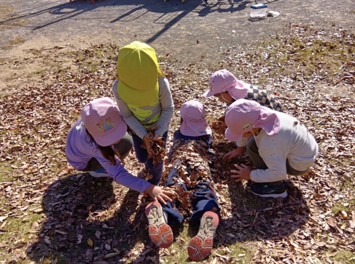 12月に近づき、冷たい風や木の葉が落ちていく様子に気付きながら過ごしている子どもたち。