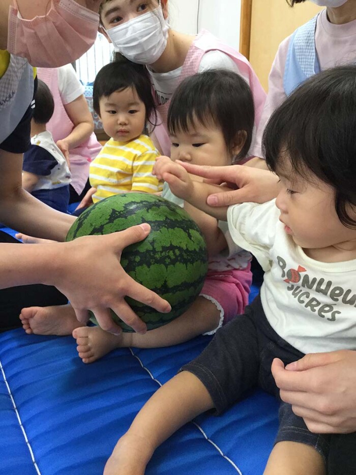 大きなスイカを目の前に「大きいー!」と盛り上がるみんな。
