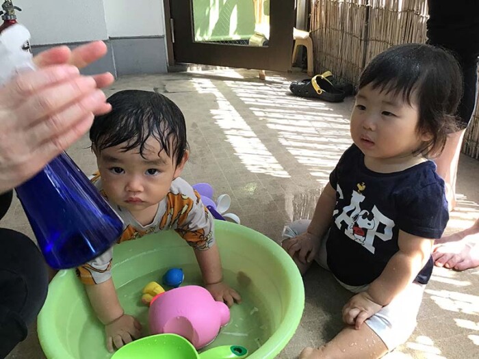 少しずつ水に慣れ、タライの中の水をスコップを使ってすくってみたり、パシャパシャと水面をたたいてみたりと水の感触を楽しんでいます。