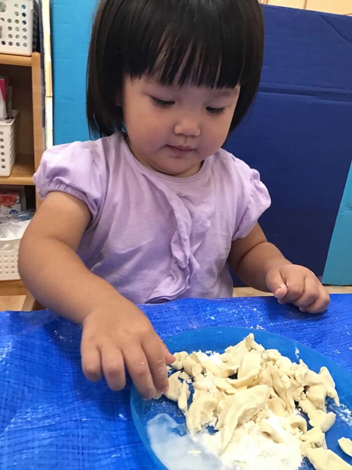 ちぎったり丸めたり、伸ばしたりして小麦粉の感触を感じながら遊びました。