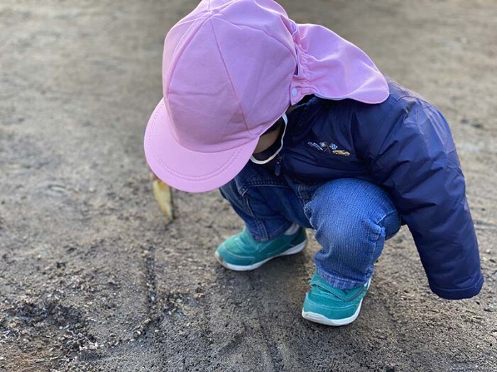 しゃがみ込んで、真剣に『何か』を見つめる子どもたち。