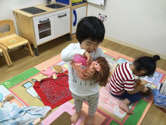 ひよこ組のお友達とも過ごす中で赤ちゃんのお世話を楽しんでいます🍼
