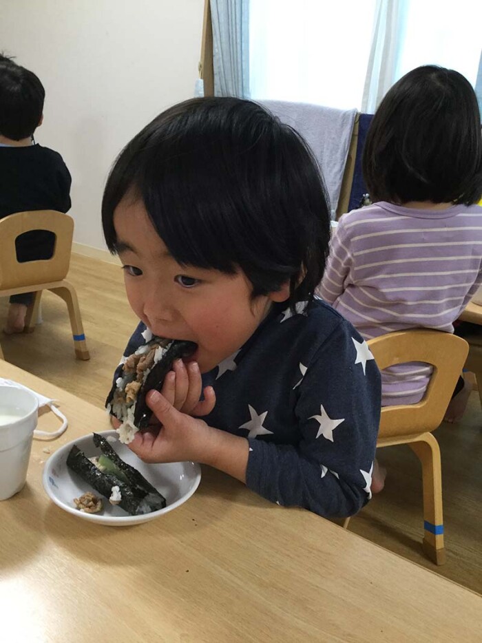 先日、尻手すきっぷ保育園でも初めての試み、恵方巻き作りをおこないました😋