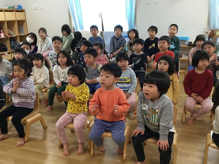 大きな声で歌うお兄さん、お姉さんに合わせて