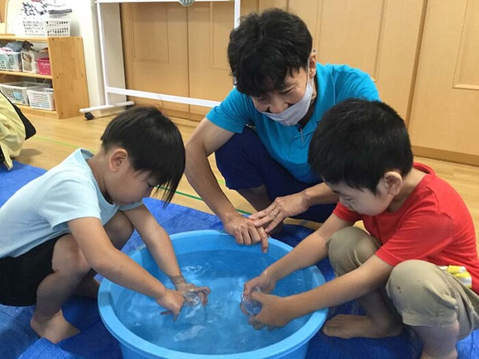 ペットボトルやグラスを使って、イラストの変化に驚いたり、