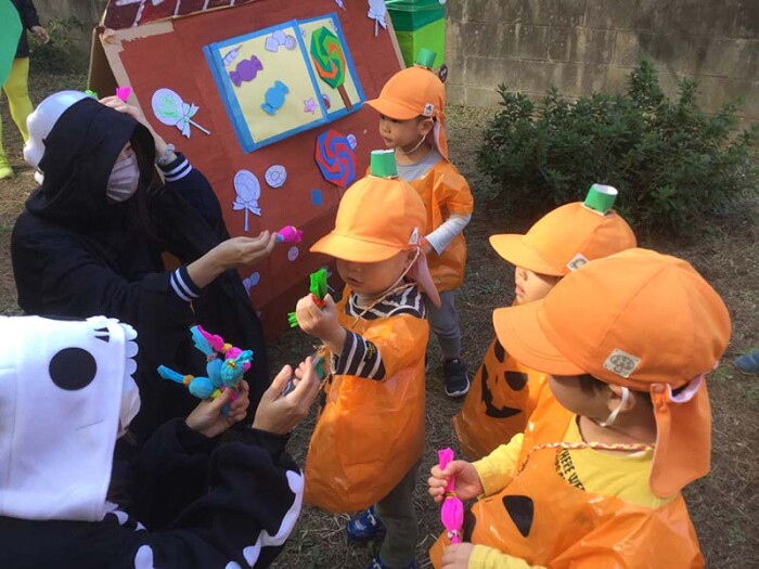 お菓子をもらう時は、「トリックオアトリート」を保育士と一緒に話してくれていました。