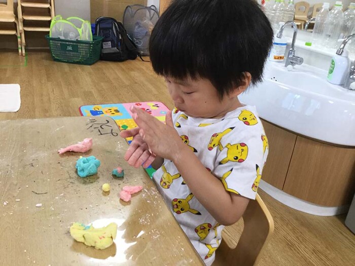 赤、青、黄色の小麦粉粘土を使って、思い思いに動物や食べ物を作って楽しみました?