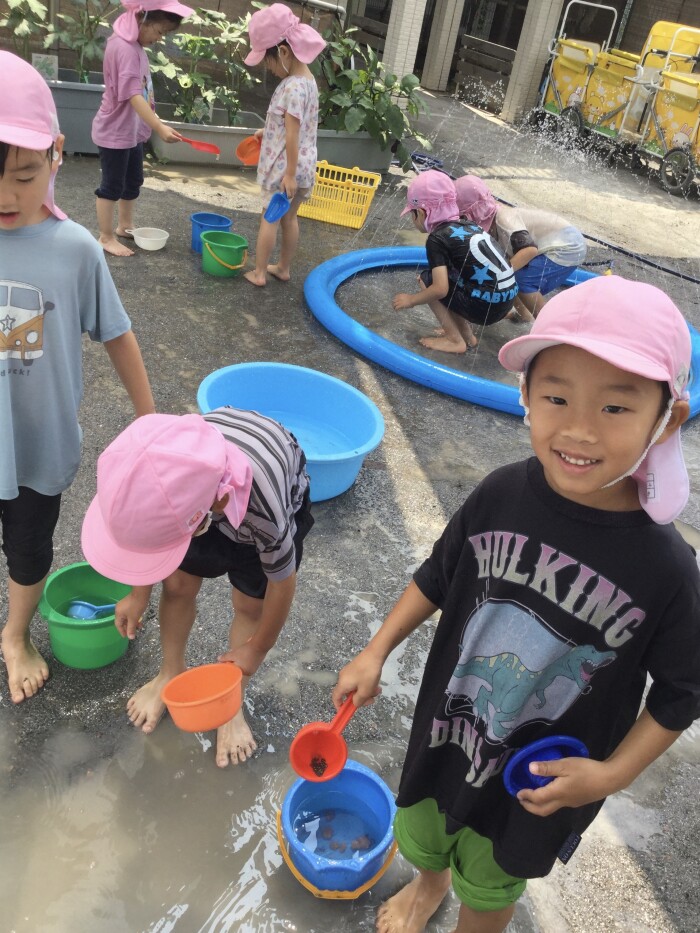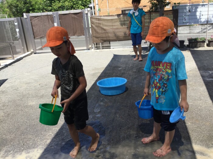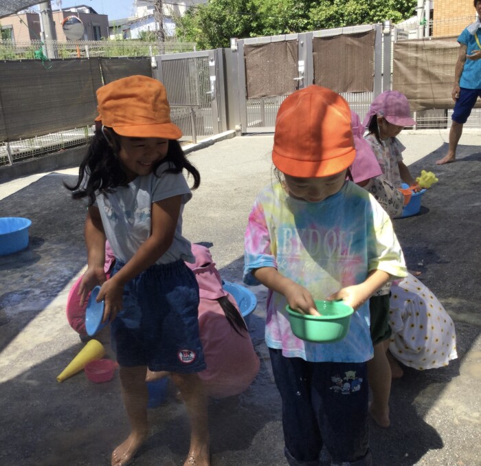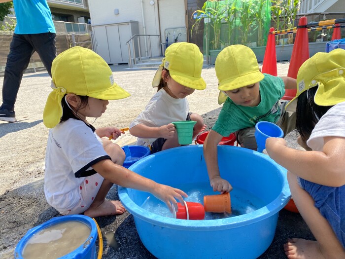 水のかけ合いで水遊びの楽しさを味わったぞう組さんは、水のかけ合いだけでなく、水を別の容器に汲んでままごとをしたり、地面にかけてみたりしています。