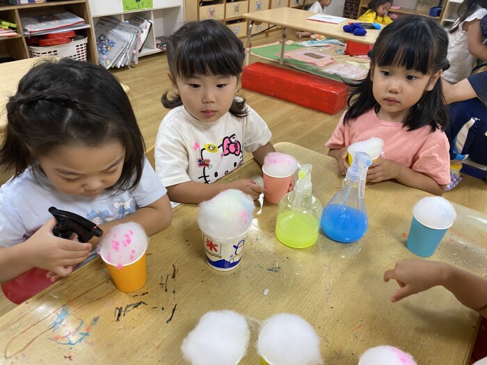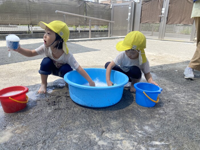 泡遊びでかき氷に見立ててみたり、子どもたちの中で大人気だった噴水マット(水が溜まらないように真ん中をくり抜いています)では大興奮でした✨