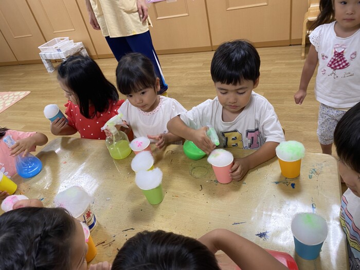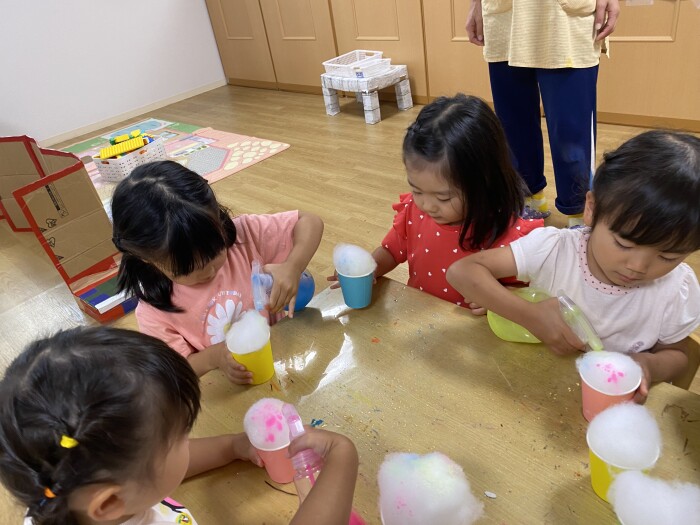 ぱんだ組は夏祭り前から「かきごおりたべた〜い!」「〇〇あじたべたよ!」と日常の中で会話として出てくることが多かった子どもたち。