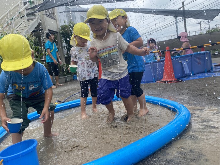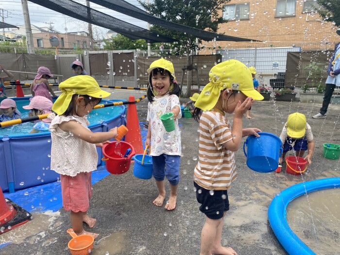 連日水遊びを楽しみながら過ごしていた子どもたち。タライの中に腕や手の平から涼しさを感じては「つめた〜い✨」「きもちいい〜❗️」と声を上げながら、楽しんでいますよ♪