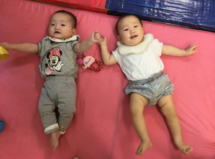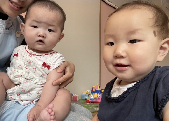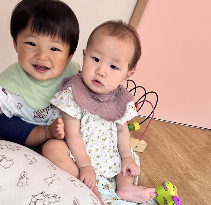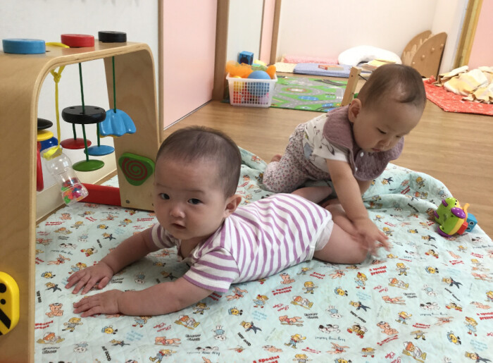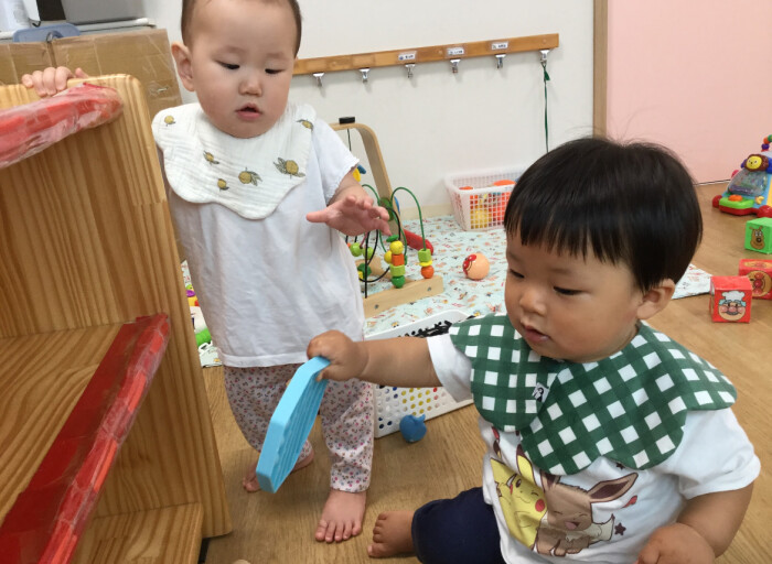 互いのしている事や発してる声に興味津々で、近づいたり、同じ事をしたり、同じおもちゃに手を伸ばす様子があり