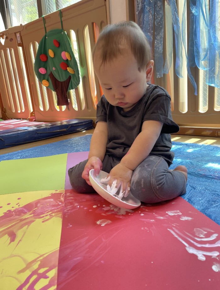 絵の具を自分で触れて感触を楽しみつつ、画用紙にぺたぺた塗って遊んだり(^^)
